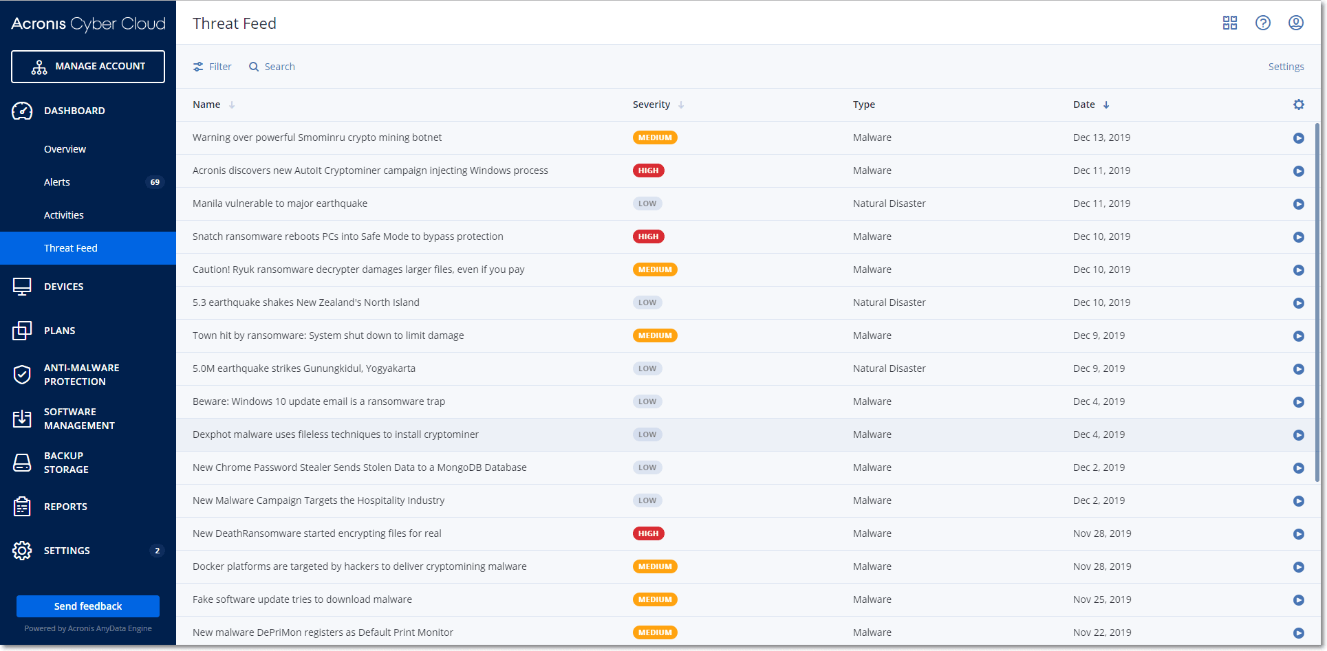 Acronis Cyber Protection Operations Center (CPOC) generates security alerts that are sent only to the related geographic regions. These security alerts provide information about malware, vulnerabilities, natural disasters, public health, and other types of global events that may affect your data protection. The threat feed informs you about all the potential threats and allows you to prevent them.
