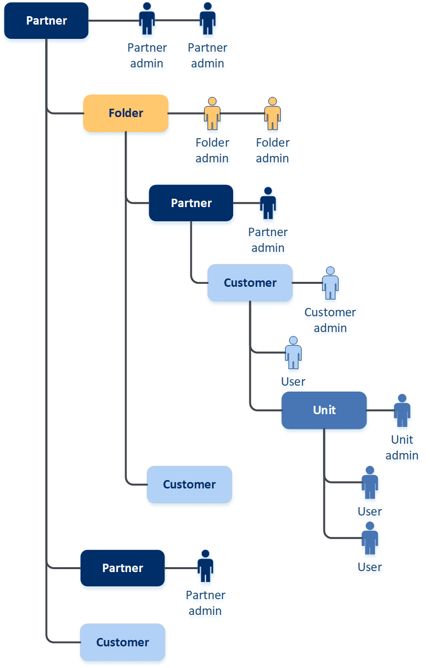 The following diagram illustrates an example hierarchy of the partner, folder, customer, and unit tenants.