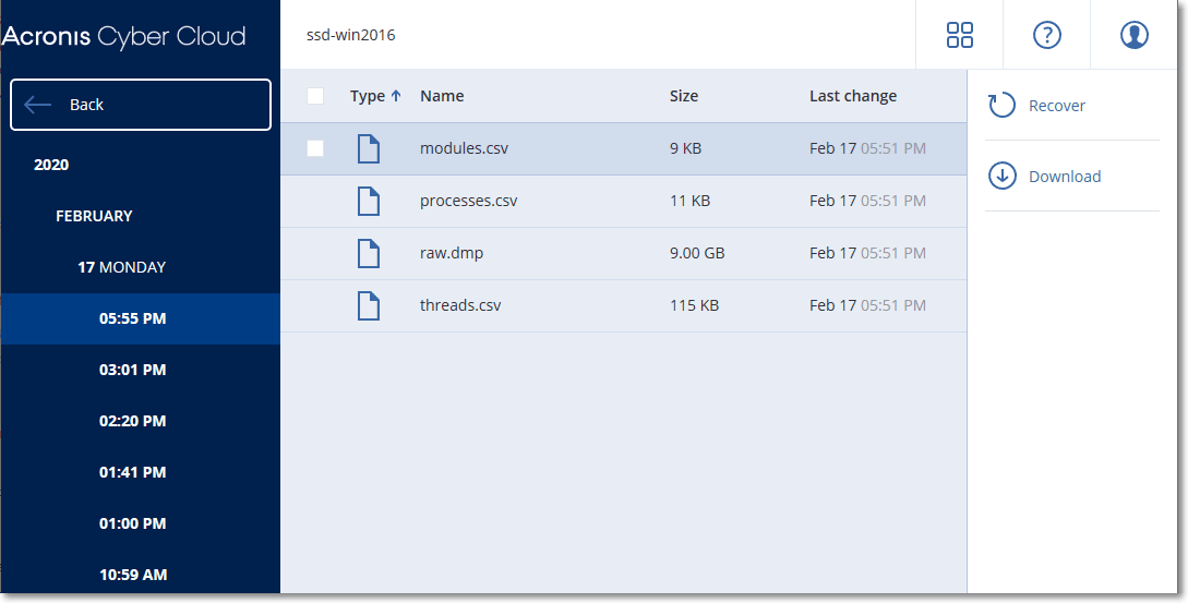 - Wählen Sie das gewünschte Backup mit den forensischen Daten aus und klicken Sie auf Backups anzeigen.
