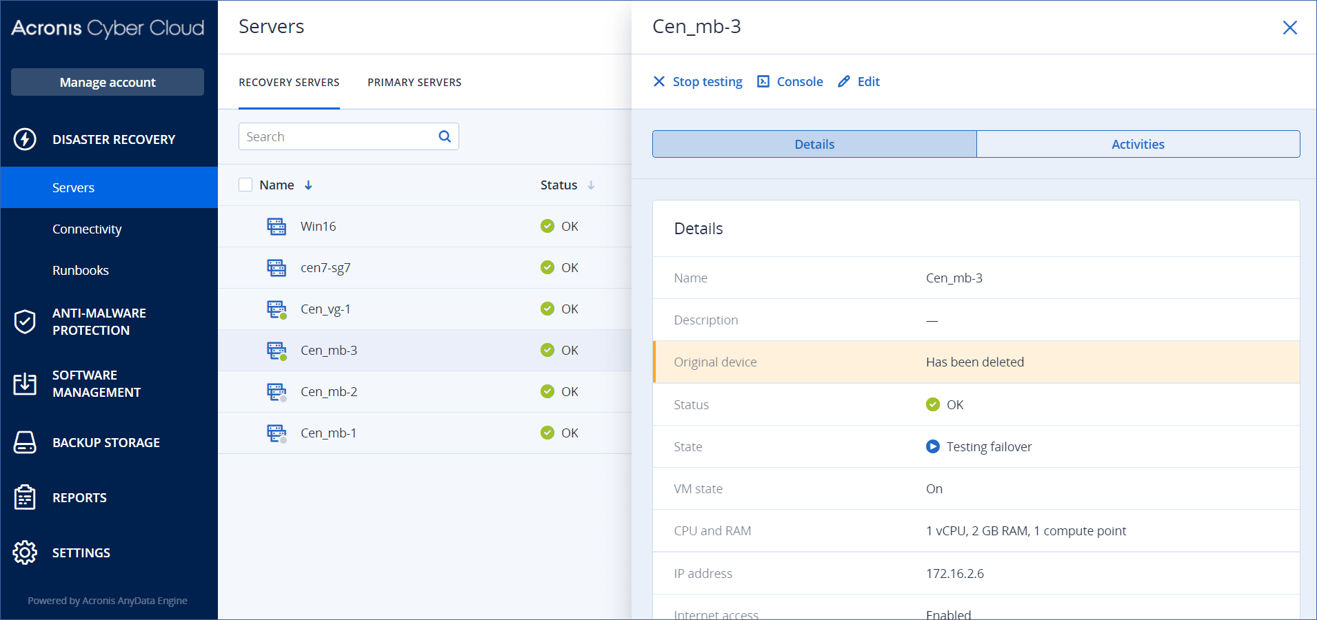 - Klik op Noodherstel > Servers, selecteer de herstelserver en klik vervolgens op Console.