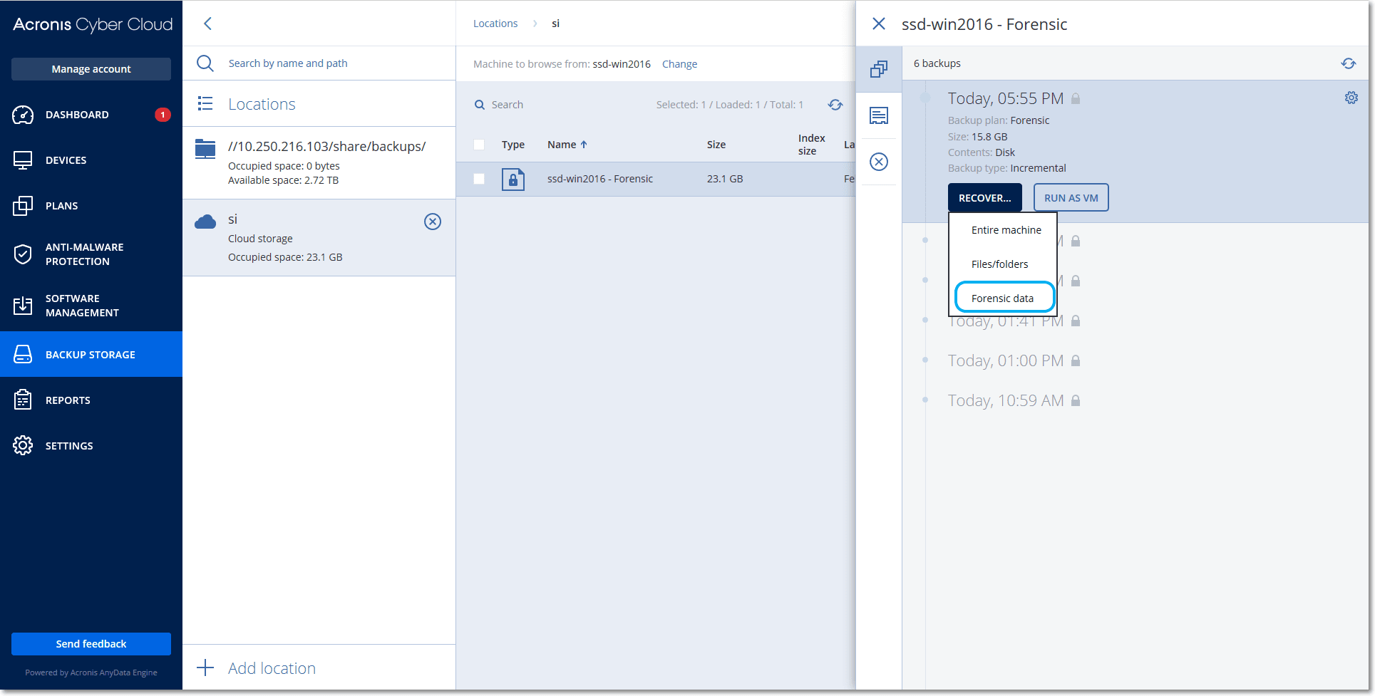 1. サービスコンソールで [バックアップストレージ] に進み、フォレンジックデータが含まれているバックアップのロケーションを選択します。
