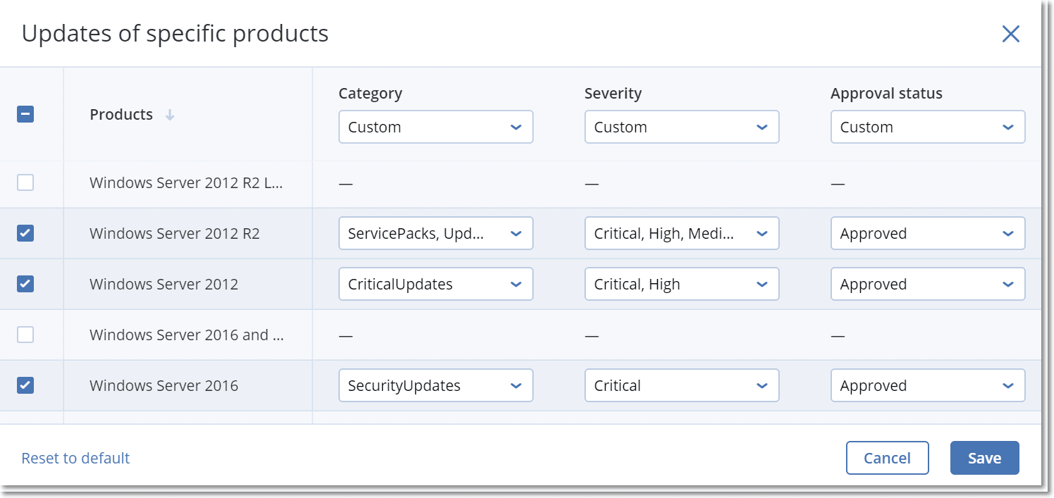 - Updates of specific products: you can define custom settings for different products. If you want to update specific products, for each product you can define which updates to install by category, severity, or approval status.