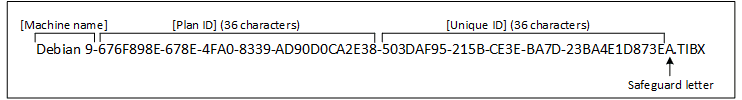Der Standarddateiname für Backups von kompletten physischen/virtuellen Maschinen, Laufwerken/Volumes, Dateien/Ordnern, Microsoft SQL Server-Datenbanken, Microsoft Exchange Server-Datenbanken und ESXi-Konfigurationen lautet: [Maschinenname]-[Plan-ID]-[Eindeutige ID]A.