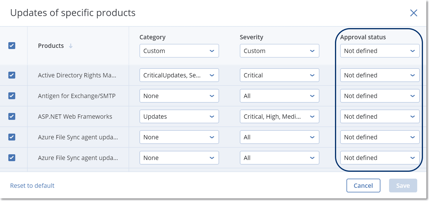 Pour tous les produits à mettre à jour, définissez le statut d'approbation sur Non défini. Lorsque le moment sera venu d'exécuter la mise à jour, l'agent installera uniquement les correctifs dont le statut est Non défini sur les machines sélectionnées dans l'environnement test.