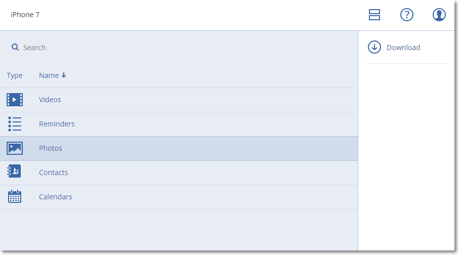Per scaricare tutte le foto, i video, i contatti, i calendari o i promemoria, selezionare la categoria di dati corrispondente. Fare clic su Download.