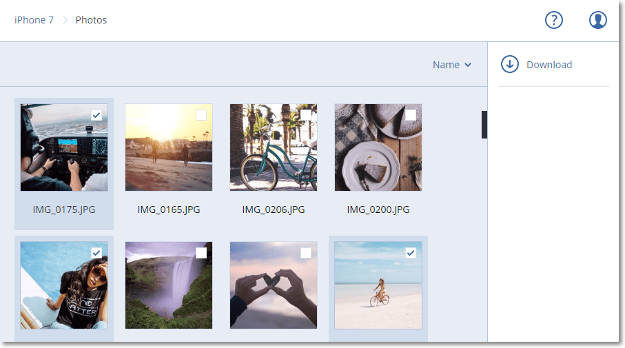 Per scaricare singole foto, video, contatti, calendari o promemoria, fare clic sul nome della relativa categoria di dati, quindi selezionare le caselle di controllo corrispondenti agli elementi di dati richiesti. Fare clic su Download.