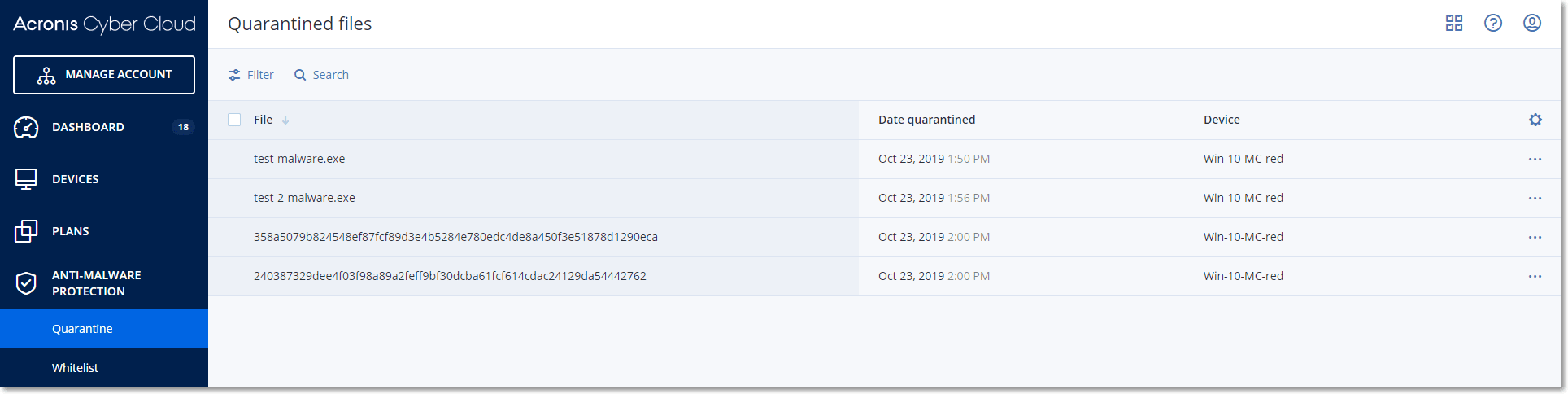 To manage the quarantined files, go to Antimalware protection > Quarantine. You will see a list with quarantined files from all machines.