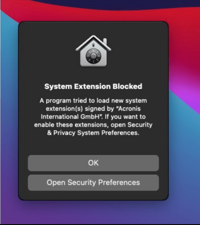 - 「系統擴充功能已封鎖」警告將會出現在受保護的工作負載上。按一下 [開啟安全性喜好設定]。