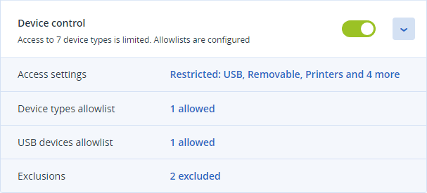 - USB devices allowlist - Shows how many USB devices/models are allowed by excluding from device access control, if any. Otherwise, indicates that the allowlist is empty. Click this summary to view or change the list of allowed USB devices/models (see steps to exclude individual USB devices from access control).