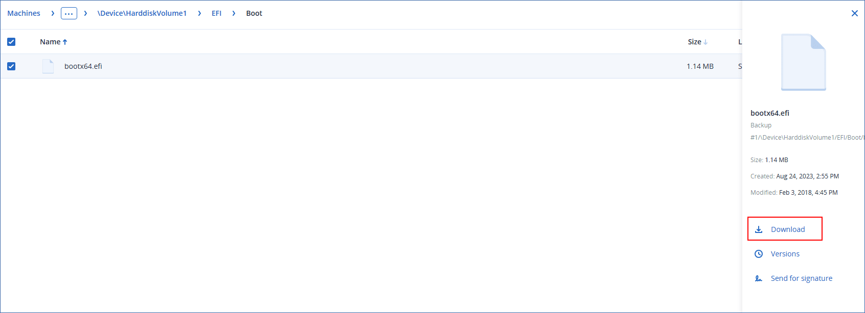 In the Web Restore console, you can browse the cloud storage, view the contents of the backups, and download backed-up files and folders.