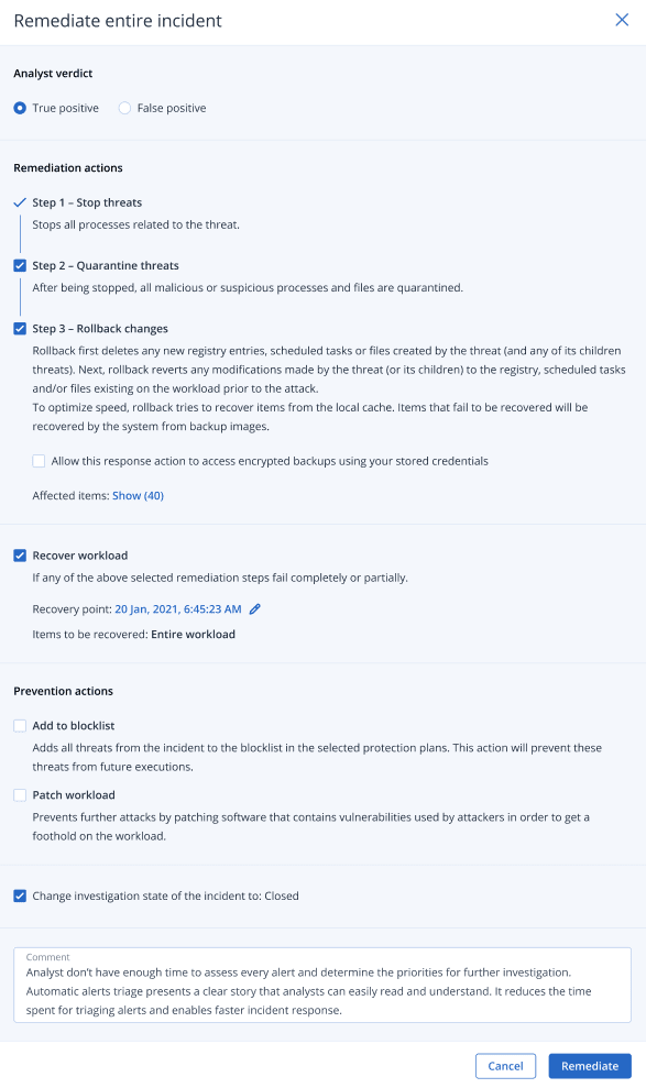 - False positive: Select if you are sure the attack is not a genuine attack. In this mode, you can define how to prevent this from happening again, such as by adding the incident to a protection plan allowlist.After selecting False positive, you can only define prevention actions. For more information, see Remediate a false positive incident.