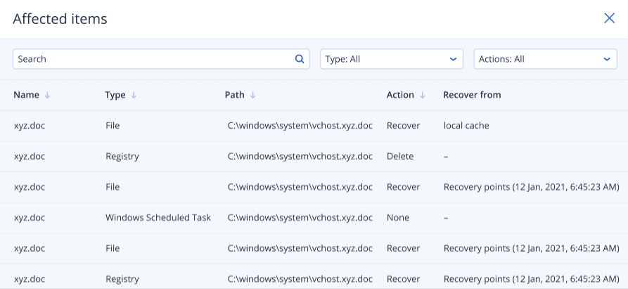 You can also click Affected items to view all items (files, registry, or scheduled tasks) affected by the rollback, the actions applied (Delete, Recover, or None), and if the items are being restored from the local cache or backup images.