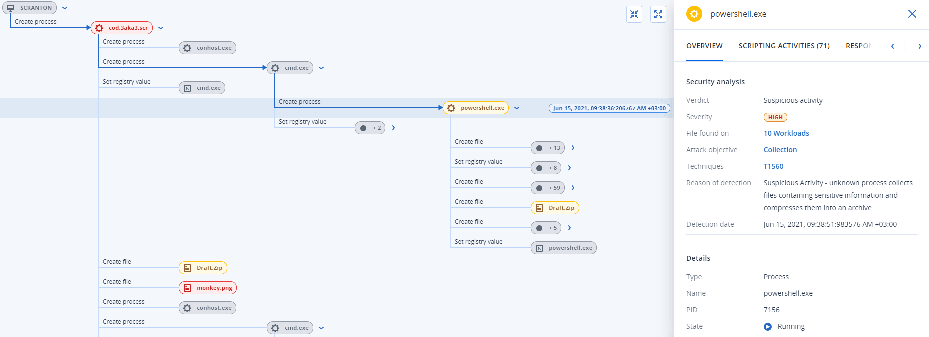 to copy the script to your clipboard for further investigation.The Scripting Activities tab is only displayed for process nodes that run commands or scripts (such as cmd or PowerShell commands). - Response Actions: Includes a number of sections that provide additional investigation, remediation and prevention actions, depending on the node type.