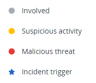 There are four main colors used in the legend, which enable you to quickly understand what happened to each node in the cyber kill chain, as shown below. These color-coded nodes are also included in the attack stages, as described in Investigate the attack stages of an incident.