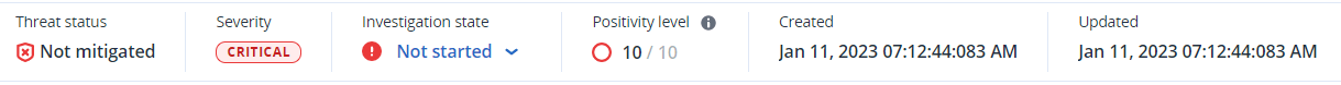 - Current threat status: The threat status is automatically defined by the system. Any incident that is Not mitigated should be investigated as soon as possible.