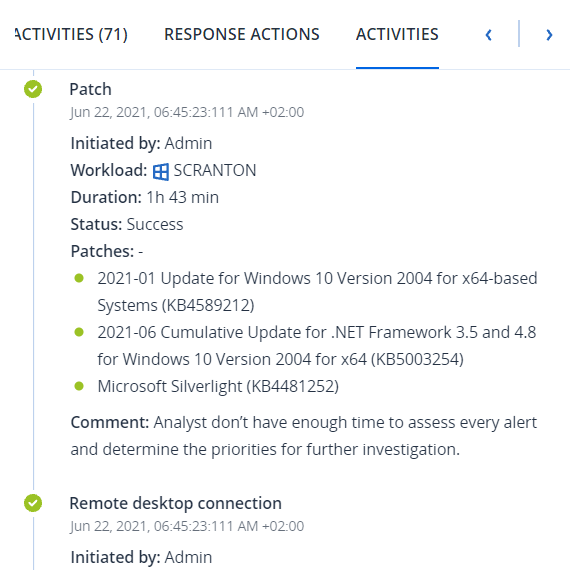 - To get a complete understanding of what actions were applied and why, you may need to scroll through the applied response actions for the node. For example, for remote desktop connection actions, you can view who started the action and when, the duration of the action, and its overall status (if it succeeded, failed, or succeeded with errors).