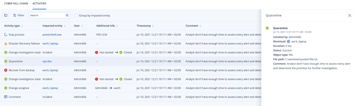 To understand the response actions taken, you can view all the response actions applied to an entire incident, or view the actions applied to a specific node in the incident cyber kill chain.