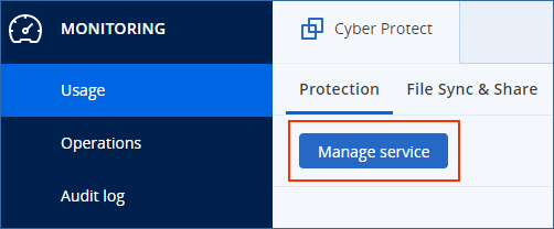 If you are already signed in to the management portal, you can go to the Cyber Protect console by navigating to Monitoring > Usage, and then, under the Protection tab, clicking Manage service.