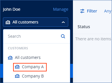 [For partner administrators who manage customer tenants] In the Cyber Protect console, select the tenant with the user for whom you want to generate a token. You cannot generate a token on the All customers level.