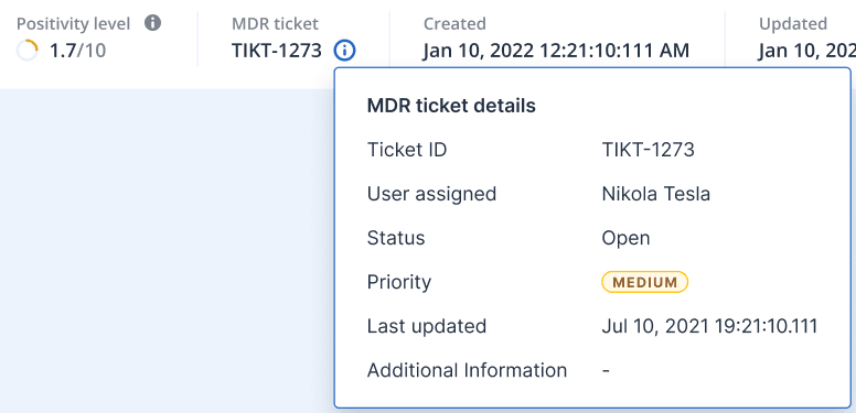 If Managed Detection and Response (MDR) is enabled on the workload, an MDR ticket field is displayed. You can view details of the MDR ticket created for the incident, and the MDR security analyst assigned to the incident.