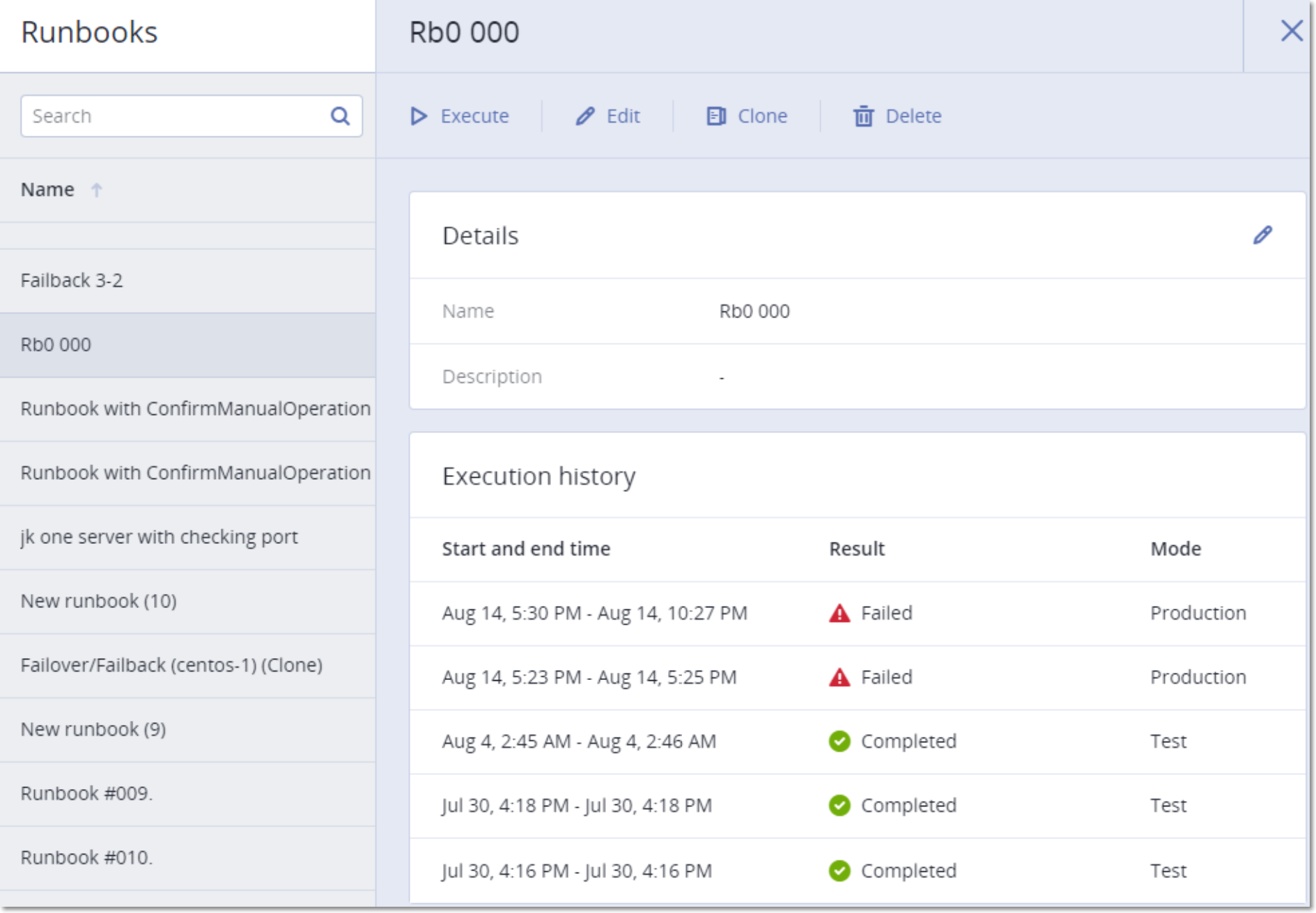 Al seleccionar un runbook de la pestaña Runbooks, el software muestra información sobre él y el historial de ejecuciones. Haga clic en la línea que corresponda a una ejecución específica para ver el registro de ejecuciones.