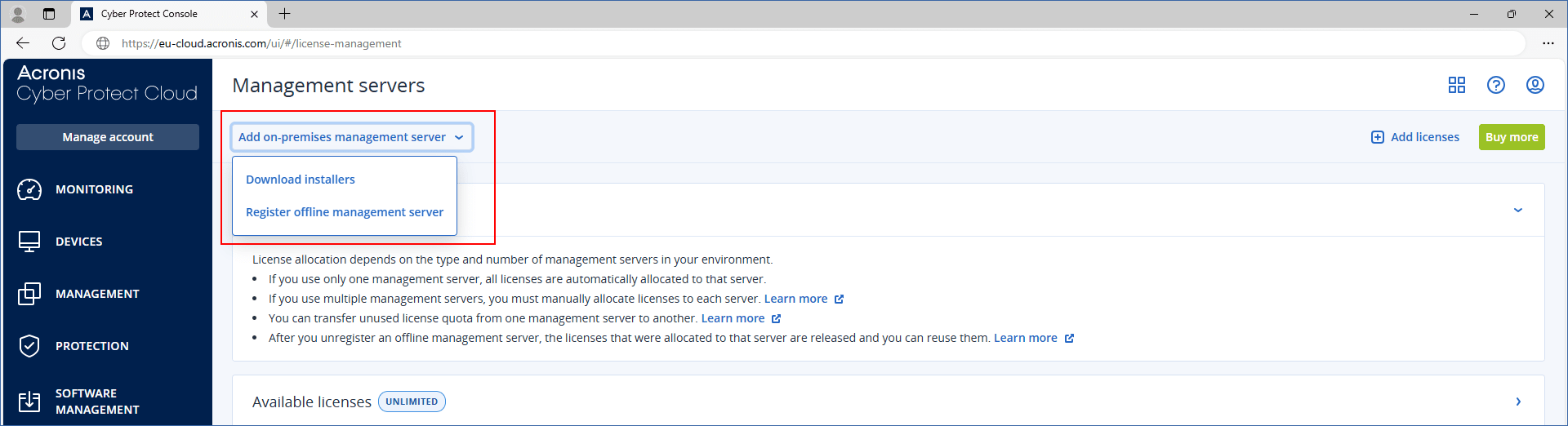 On the machine that is connected to the Internet, log in to the cloud console (https://cloud.acronis.com), and then go to Settings > Management servers.
