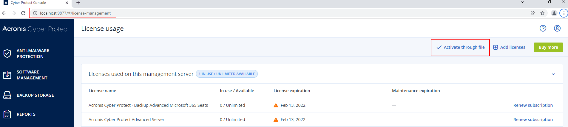 In the local console of the offline management server (https://<IP>:<port>), go to the Activation through file dialog.