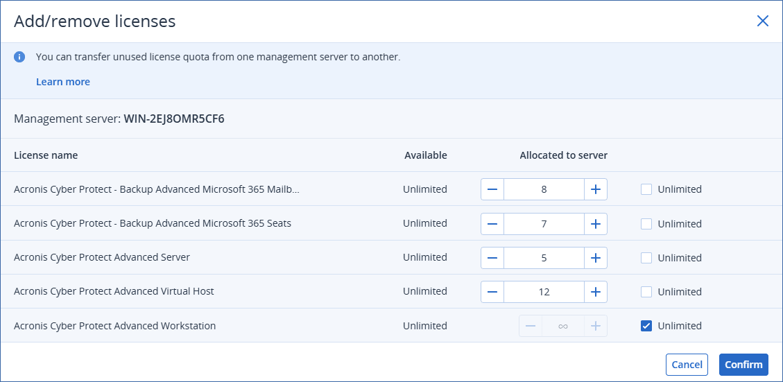 Go to the management server for which you want to decrease the license quota, and then click Add/remove licenses.