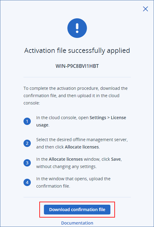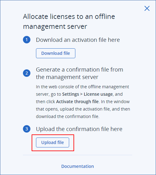 In the Allocate licenses to an offline management server dialog, click Upload file, and then select the confirmation file that you downloaded from your offline management server.
