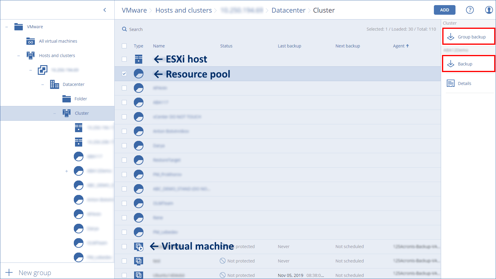 For example, you have selected the cluster and then selected a resource pool inside it. If you click Backup, all virtual machines included in the selected resource pool will be backed up. If you click Group backup, all virtual machines included in the cluster will be backed up.